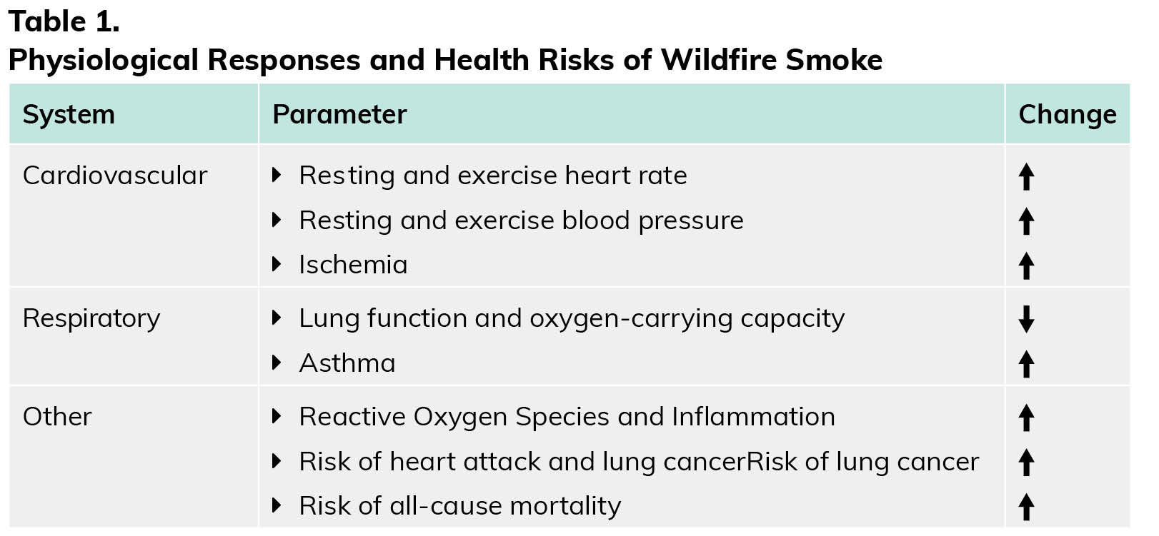 Wildfire smoke contains large quantities of airborne particles that are known as fine particulate matter (PM). These particles are small and referred to as PM2.5 because they are 2.5 micrometers in diameter or less. Short-term exposure to PM2.5 is a major health concern, as these inhaled particles are small enough to penetrate deeply into the lungs and enter the bloodstream, where they can cause systemic inflammation. Over time, this inflammation contributes to multiple chronic conditions, and chronic exposure to wildfire smoke has been linked to various health problems and even premature death. For example, one study estimated that long-term exposure to wildfire smoke contributed to approximately 11,415 nonaccidental premature deaths annually in the U.S. Table 1 details the common physiological responses and health risks attributable to wildfire smoke.