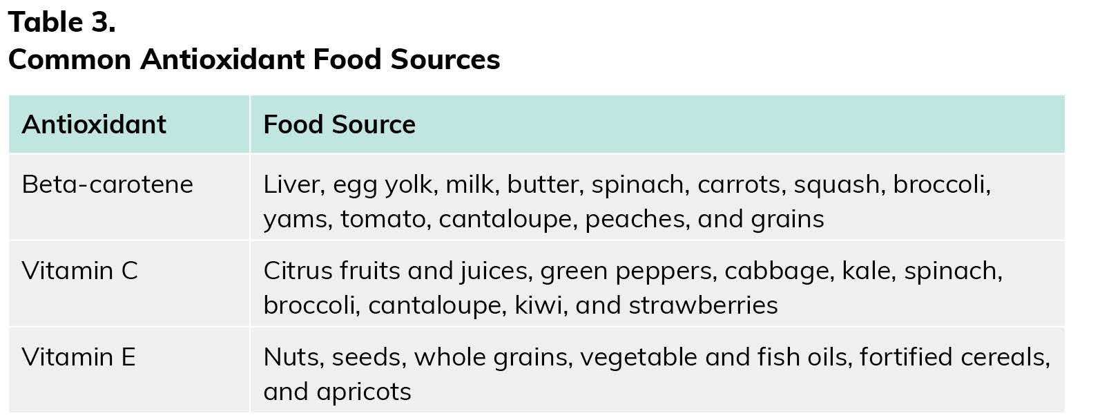 Antioxidants are molecules that can scavenge and safely interact with free radicals. Specifically, antioxidants can help mitigate free radical–induced negative chain reactions and protect cell membranes from oxidative damage. Antioxidants can be either endogenous (originating within the body) or exogenous (originating outside of the body, via nutritional habits or supplementation, for example). The main exogenous antioxidants include vitamins C and E and beta-carotene (the precursor to vitamin A). Research highlights that antioxidant intake benefits individuals exercising in, and chronically exposed to, air pollution, including wildfire smoke. Common food sources for antioxidants are listed in Table 3.