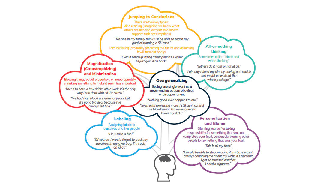 This graphic presents some additional cognitive distortions that may reinforce your clients’ negative thoughts and feelings and lead to chronically negative and unproductive views of themselves and life.