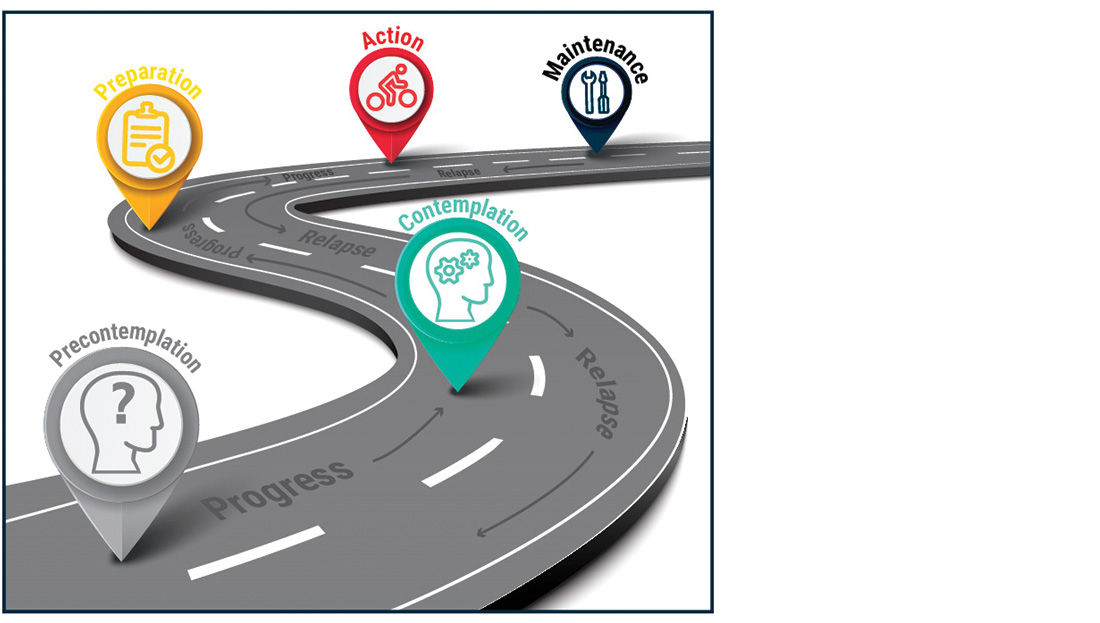 Change is easy. In reality, change is a nonlinear, back-and-forth process. This is one reason the transtheoretical model of behavior change (Figure 1) is often displayed as a winding road or a funnel image, as it accurately represents the fluidity of movement through the stages, lapses and all. Humans travel back and forth and up and down along their journeys. That’s expected. It’s normal. It’s part of the process.